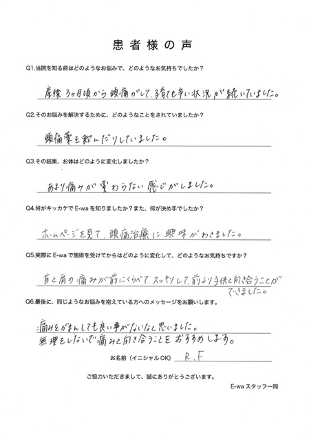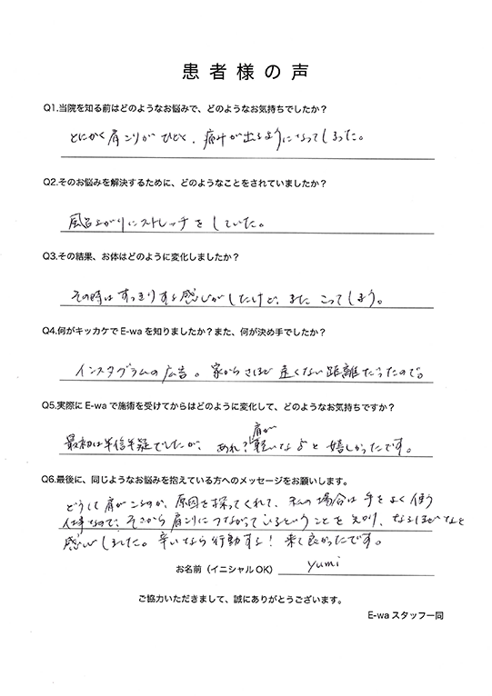 日頃から肩こりは感じていて、自分でジョギングやストレッチをしても肩甲骨が動きにくくて全然改善しませんでした。たまにリンパマッサージに行くと少し良くなるけど、また戻っての繰り返しでした。育児や仕事のストレスで、ひどい時は頭痛を我慢しながら生活していましたが、E-waさんはインスタグラムで知って、近くを通ったこともあるし家からも通いやすいと思って連絡しました。