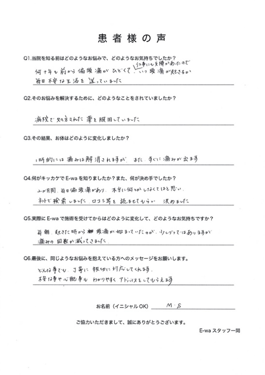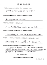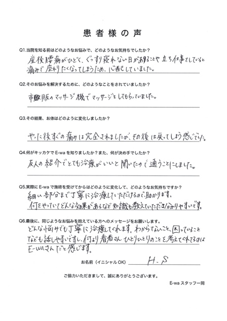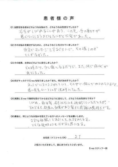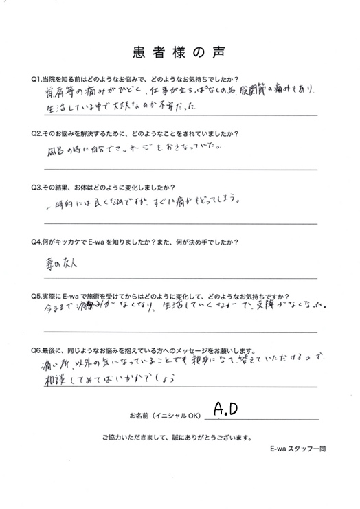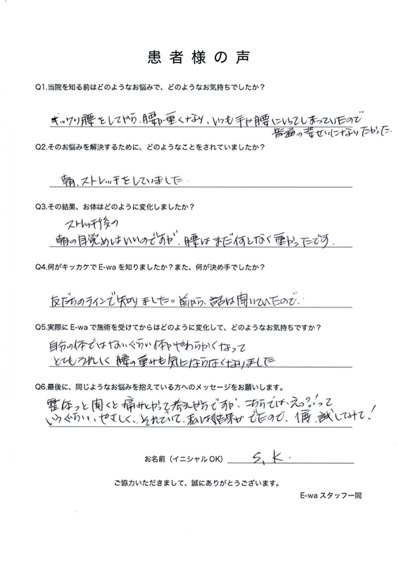 知り合いから「腕が良い」とE-waさんの噂を聞いていましたが、初回に受けた次の日から早速、効果を実感することができました。痛みを感じずに過ごせて嬉しかった! 施術自体も痛みもなく、お話も楽しいので安心して通えます。